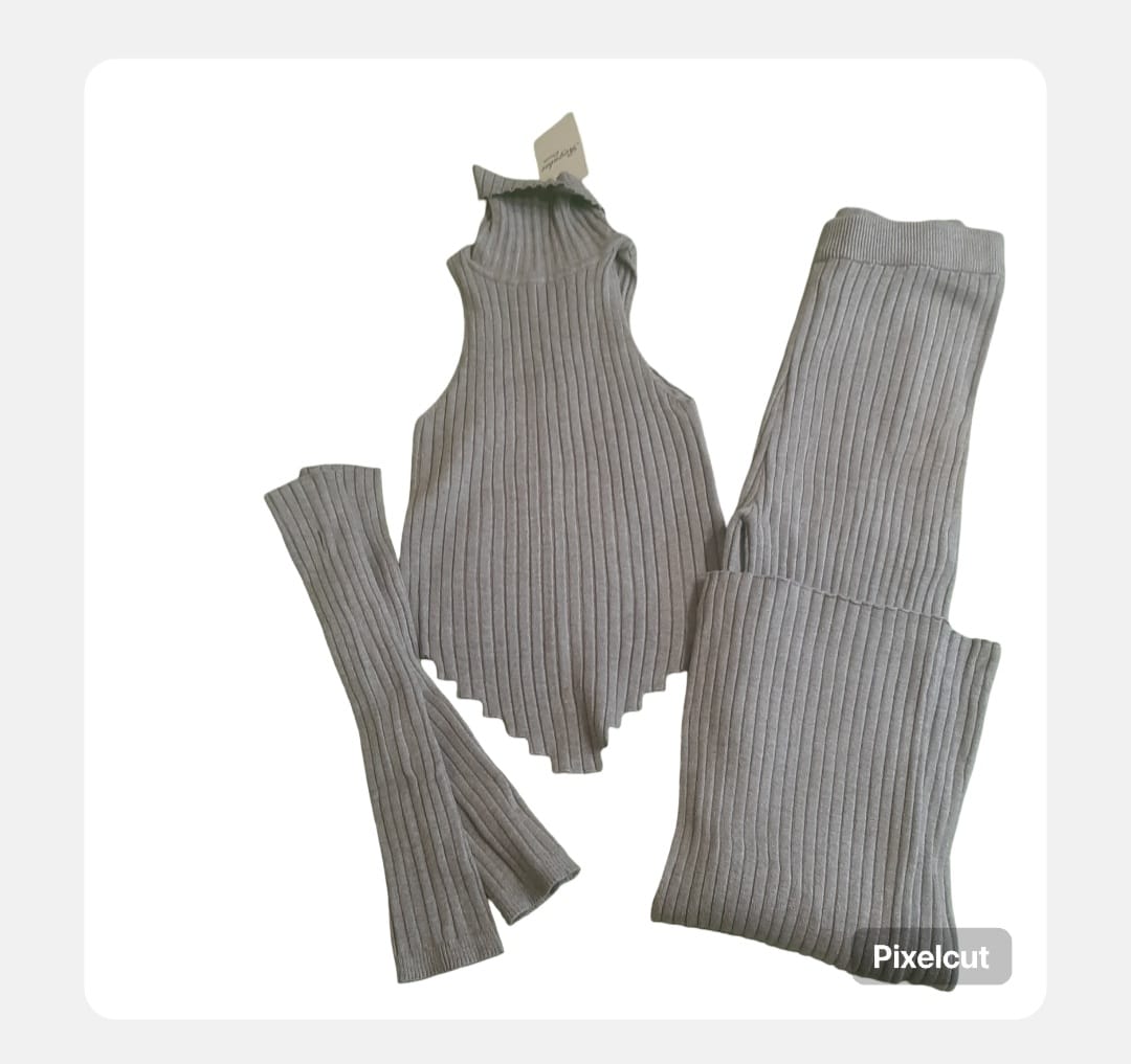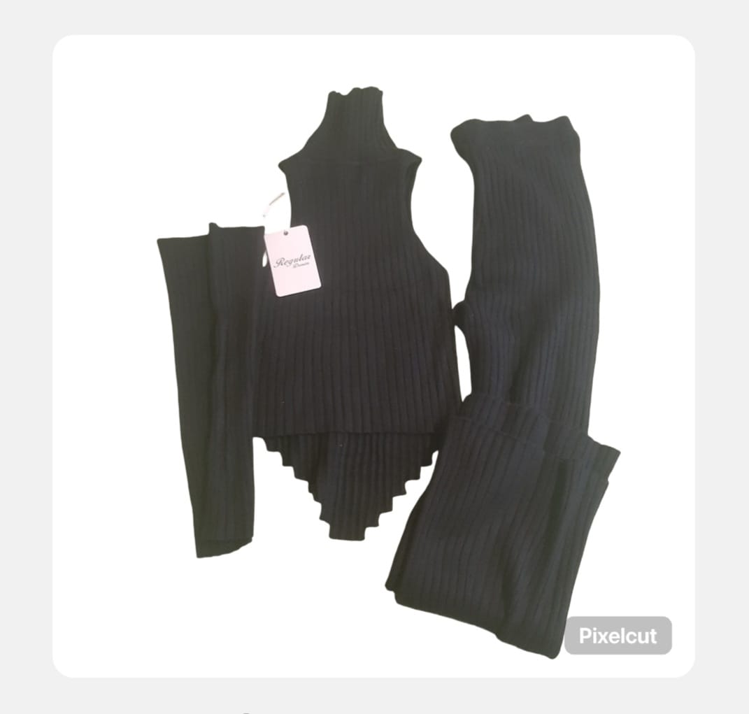 Completo tre pezzi composto da maglia in lana, pantaloni coordinato e manichotti abbinati.
